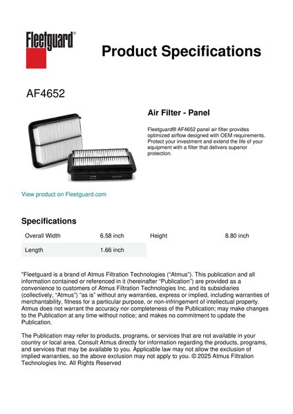 Fleetguard® AF4652 panel air filter provides optimized airflow designed with OEM requirements. Protect your investment and extend the life of your equipment with a filter that delivers superior protection.Specification