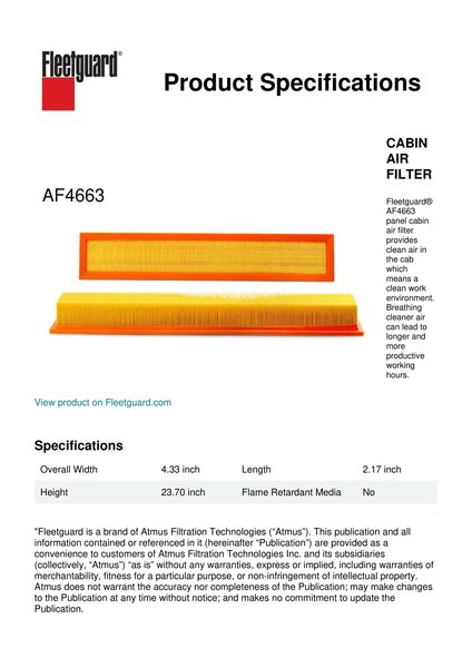 Fleetguard® AF4663 panel cabin air filter provides clean air in the cab which means a clean work environment. Breathing cleaner air can lead to longer and more productive working hours.Specification
