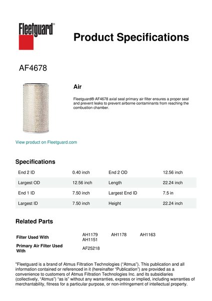 Fleetguard® AF4678 axial seal primary air filter ensures a proper seal and prevent leaks to prevent airborne contaminants from reaching the combustion chamber.