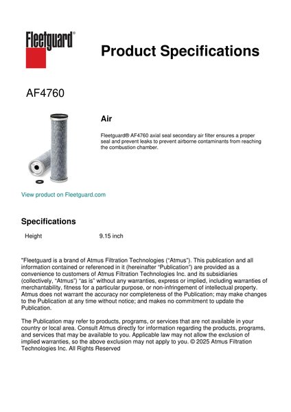 Fleetguard® AF4760 axial seal secondary air filter ensures a proper seal and prevent leaks to prevent airborne contaminants from reaching the combustion chamber.