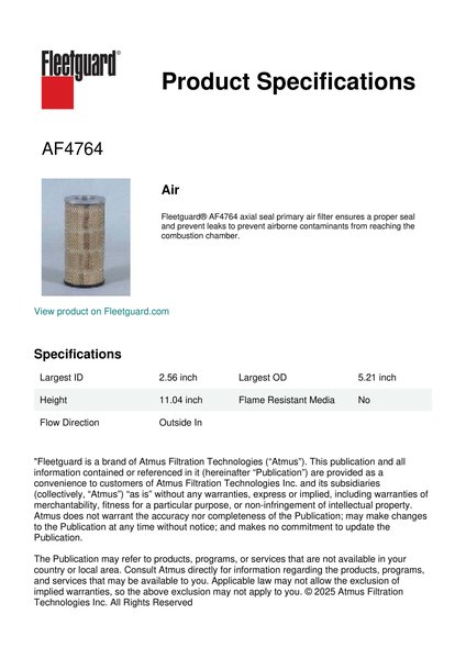 Fleetguard® AF4764 axial seal primary air filter ensures a proper seal and prevent leaks to prevent airborne contaminants from reaching the combustion chamber.