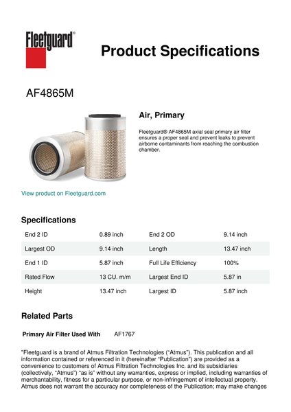 Fleetguard® AF4865M axial seal primary air filter ensures a proper seal and prevent leaks to prevent airborne contaminants from reaching the combustion chamber.
