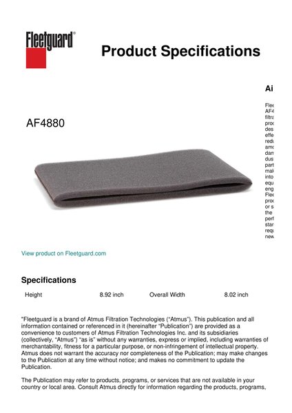 Fleetguard® AF4880 air filtration products are designed to effectively reduce the amount of damage-causing dust and dirt particles that make their way into your equipment’s engine. Every Fleetguard product meets or surpasses the quality and performance standards required by a new engine.Specification