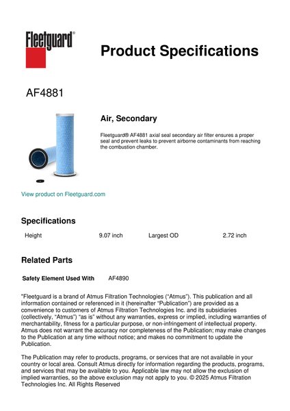 Fleetguard® AF4881 axial seal secondary air filter ensures a proper seal and prevent leaks to prevent airborne contaminants from reaching the combustion chamber.Specification