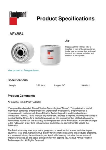 Fleetguard® AF4884 air filter is installed in front of the carburetor or intake pipe to remove dust and sand in the air and ensure sufficient and clean air in the cylinder.Specification