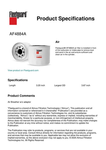 Fleetguard® AF4884A air filter is installed in front of the carburetor or intake pipe to remove dust and sand in the air and ensure sufficient and clean air in the cylinder.Specification