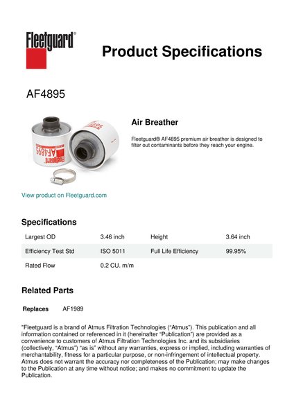 Fleetguard® AF4895 premium air breather is designed to filter out contaminants before they reach your engine.Specification