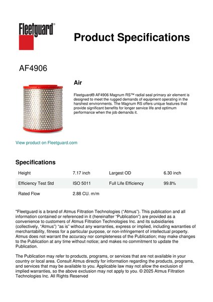 Fleetguard® AF4906 Magnum RS™ radial seal primary air element is designed to meet the rugged demands of equipment operating in the harshest environments. The Magnum RS offers unique features that provide significant benefits for longer service life and optimum performance when the job demands it.Specification