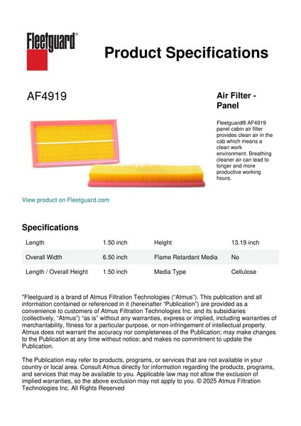 Fleetguard® AF4919 panel cabin air filter provides clean air in the cab which means a clean work environment. Breathing cleaner air can lead to longer and more productive working hours.Specification