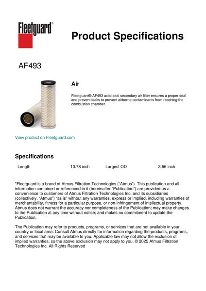 Fleetguard® AF493 axial seal secondary air filter ensures a proper seal and prevent leaks to prevent airborne contaminants from reaching the combustion chamber.Specification