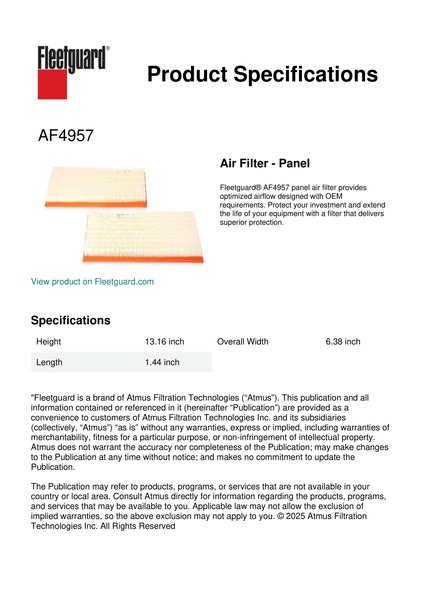 Fleetguard® AF4957 panel air filter provides optimized airflow designed with OEM requirements. Protect your investment and extend the life of your equipment with a filter that delivers superior protection.Specification