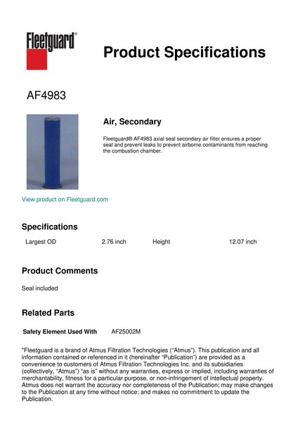 Fleetguard® AF4983 axial seal secondary air filter ensures a proper seal and prevent leaks to prevent airborne contaminants from reaching the combustion chamber.
