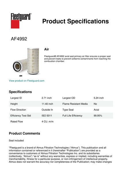 Fleetguard® AF4992 axial seal primary air filter ensures a proper seal and prevent leaks to prevent airborne contaminants from reaching the combustion chamber.