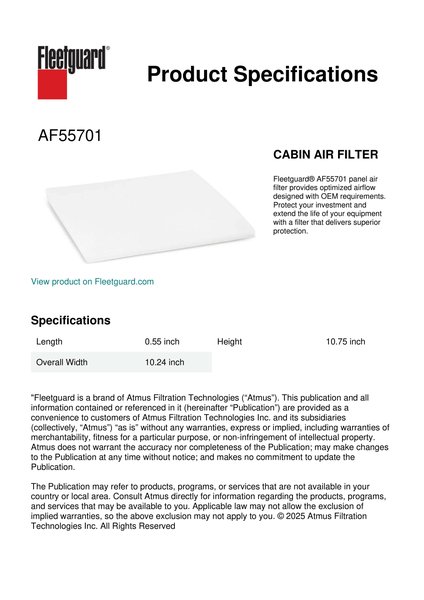 Fleetguard® AF55701 panel air filter provides optimized airflow designed with OEM requirements. Protect your investment and extend the life of your equipment with a filter that delivers superior protection.Specification