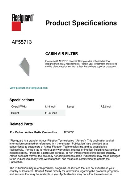 Fleetguard® AF55713 panel air filter provides optimized airflow designed with OEM requirements. Protect your investment and extend the life of your equipment with a filter that delivers superior protection.Specification