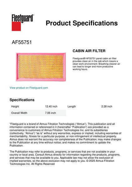 Fleetguard® AF55751 panel cabin air filter provides clean air in the cab which means a clean work environment. Breathing cleaner air can lead to longer and more productive working hours.Specification