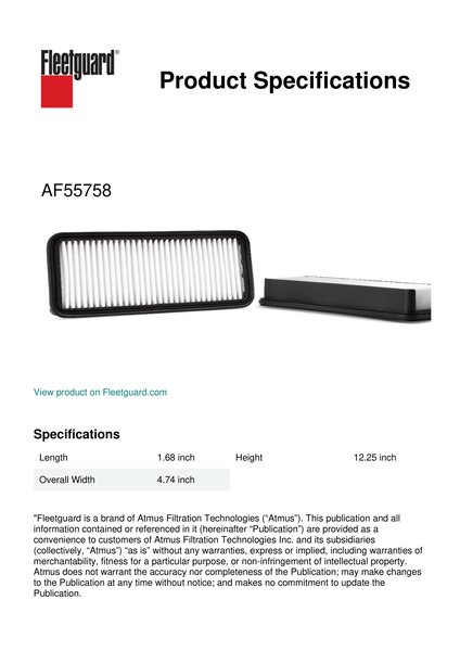 Fleetguard® AF55758 panel cabin air filter provides clean air in the cab which means a clean work environment. Breathing cleaner air can lead to longer and more productive working hours.Specification