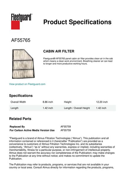 Fleetguard® AF55765 panel cabin air filter provides clean air in the cab which means a clean work environment. Breathing cleaner air can lead to longer and more productive working hours.Specification