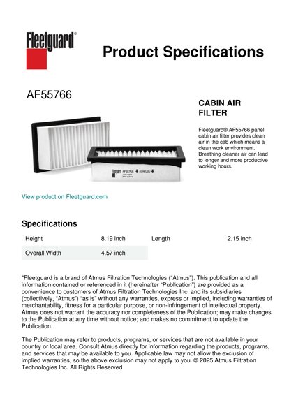 Fleetguard® AF55766 panel cabin air filter provides clean air in the cab which means a clean work environment. Breathing cleaner air can lead to longer and more productive working hours.Specification
