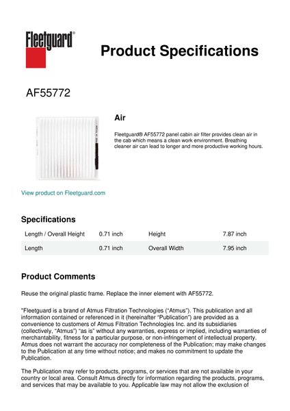 Fleetguard® AF55772 panel cabin air filter provides clean air in the cab which means a clean work environment. Breathing cleaner air can lead to longer and more productive working hours.Specification