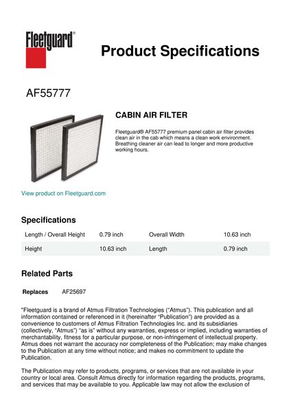 Fleetguard® AF55777 premium panel cabin air filter provides clean air in the cab which means a clean work environment. Breathing cleaner air can lead to longer and more productive working hours.Specification