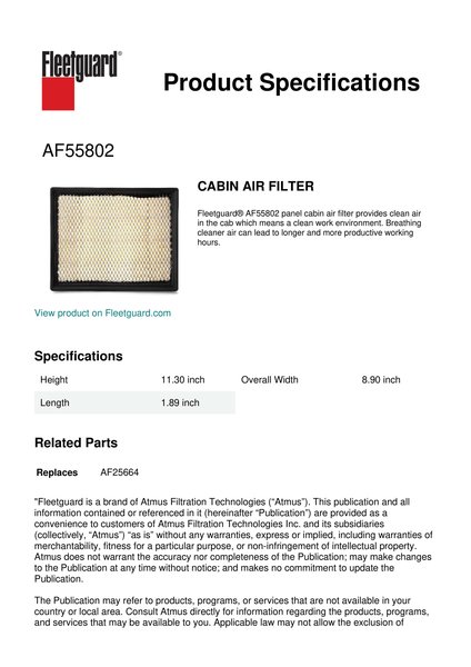 Fleetguard® AF55802 panel cabin air filter provides clean air in the cab which means a clean work environment. Breathing cleaner air can lead to longer and more productive working hours.Specification