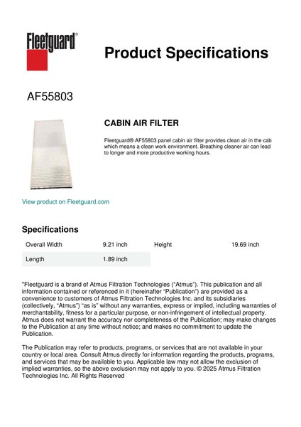 Fleetguard® AF55803 panel cabin air filter provides clean air in the cab which means a clean work environment. Breathing cleaner air can lead to longer and more productive working hours.Specification
