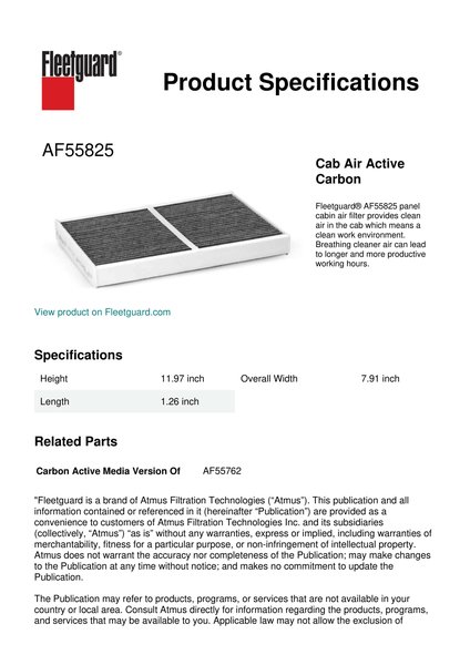 Fleetguard® AF55825 panel cabin air filter provides clean air in the cab which means a clean work environment. Breathing cleaner air can lead to longer and more productive working hours.Specification