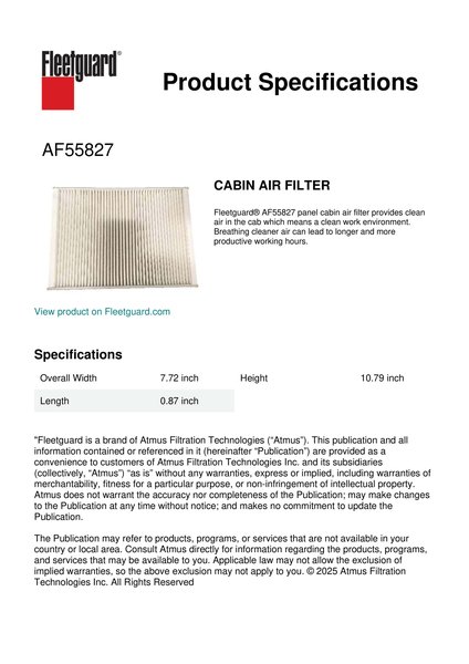 Fleetguard® AF55827 panel cabin air filter provides clean air in the cab which means a clean work environment. Breathing cleaner air can lead to longer and more productive working hours.Specification