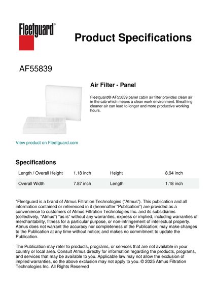 Fleetguard® AF55839 panel cabin air filter provides clean air in the cab which means a clean work environment. Breathing cleaner air can lead to longer and more productive working hours.Specification