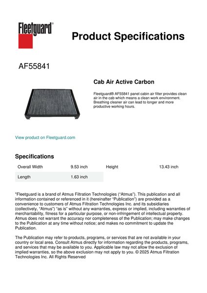 Fleetguard® AF55841 panel cabin air filter provides clean air in the cab which means a clean work environment. Breathing cleaner air can lead to longer and more productive working hours.Specification