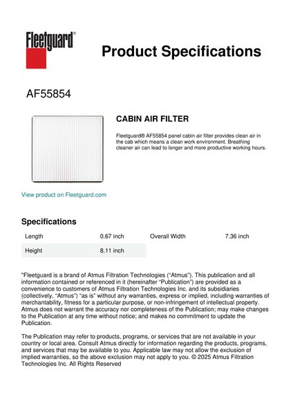 Fleetguard® AF55854 panel cabin air filter provides clean air in the cab which means a clean work environment. Breathing cleaner air can lead to longer and more productive working hours.Specification
