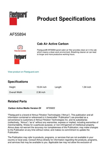 Fleetguard® AF55894 panel cabin air filter provides clean air in the cab which means a clean work environment. Breathing cleaner air can lead to longer and more productive working hours.Specification
