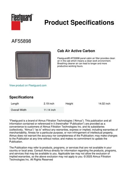 Fleetguard® AF55898 panel cabin air filter provides clean air in the cab which means a clean work environment. Breathing cleaner air can lead to longer and more productive working hours.Specification