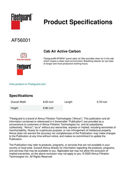 Fleetguard® AF56001 panel cabin air filter provides clean air in the cab which means a clean work environment. Breathing cleaner air can lead to longer and more productive working hours.Specification
