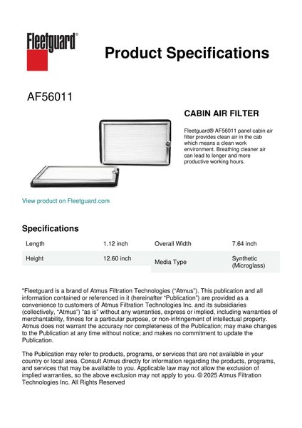 Fleetguard® AF56011 panel cabin air filter provides clean air in the cab which means a clean work environment. Breathing cleaner air can lead to longer and more productive working hours.Specification