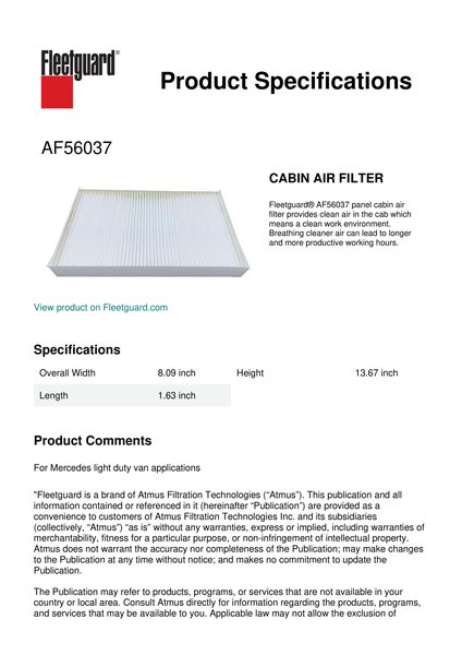 Fleetguard® AF56037 panel cabin air filter provides clean air in the cab which means a clean work environment. Breathing cleaner air can lead to longer and more productive working hours.Specification