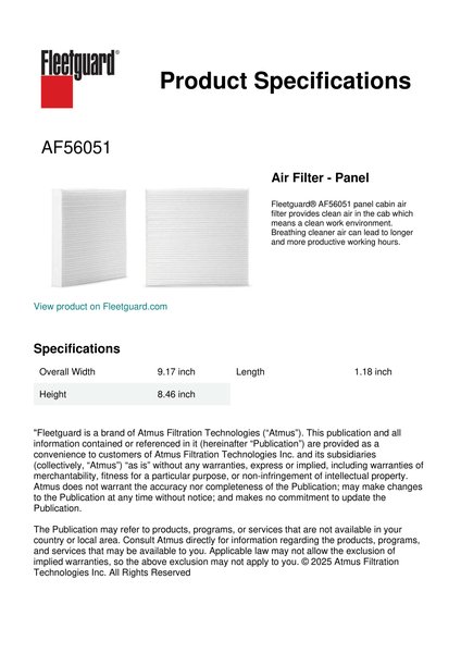 Fleetguard® AF56051 panel cabin air filter provides clean air in the cab which means a clean work environment. Breathing cleaner air can lead to longer and more productive working hours.Specification