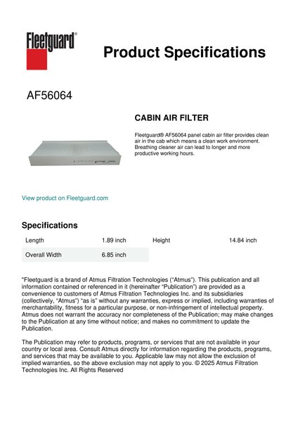 Fleetguard AF56064 Replacement Cabin Air Filter