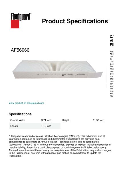 Fleetguard® AF56066 panel cabin air filter provides clean air in the cab which means a clean work environment. Breathing cleaner air can lead to longer and more productive working hours.Specification