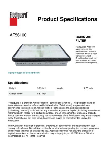 Fleetguard® AF56100 panel cabin air filter provides clean air in the cab which means a clean work environment. Breathing cleaner air can lead to longer and more productive working hours.Specification