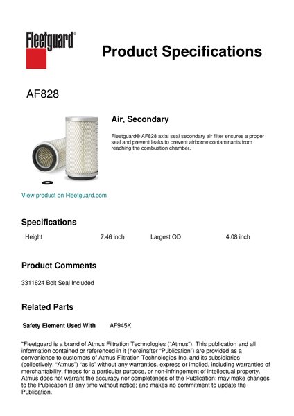 Fleetguard® AF828 axial seal secondary air filter ensures a proper seal and prevent leaks to prevent airborne contaminants from reaching the combustion chamber.