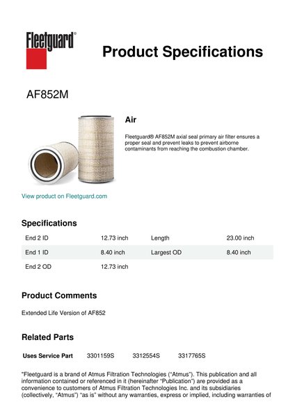 Fleetguard® AF852M axial seal primary air filter ensures a proper seal and prevent leaks to prevent airborne contaminants from reaching the combustion chamber.