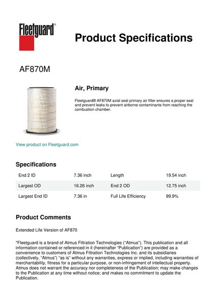 Fleetguard® AF870M axial seal primary air filter ensures a proper seal and prevent leaks to prevent airborne contaminants from reaching the combustion chamber.Specification