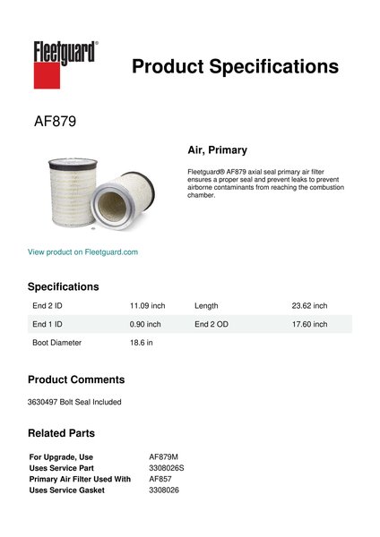 Fleetguard® AF879 axial seal primary air filter ensures a proper seal and prevent leaks to prevent airborne contaminants from reaching the combustion chamber.