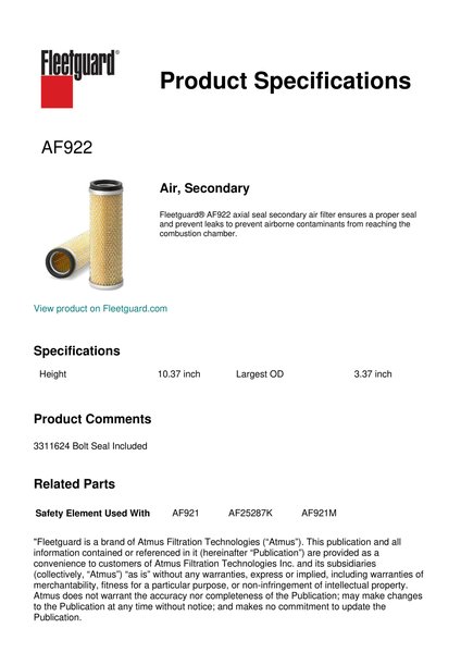Fleetguard® AF922 axial seal secondary air filter ensures a proper seal and prevent leaks to prevent airborne contaminants from reaching the combustion chamber.Specification