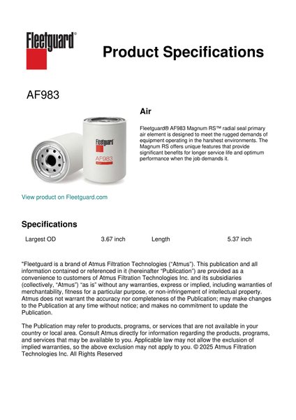 Fleetguard® AF983 Magnum RS™ radial seal primary air element is designed to meet the rugged demands of equipment operating in the harshest environments. The Magnum RS offers unique features that provide significant benefits for longer service life and optimum performance when the job demands it.Specification
