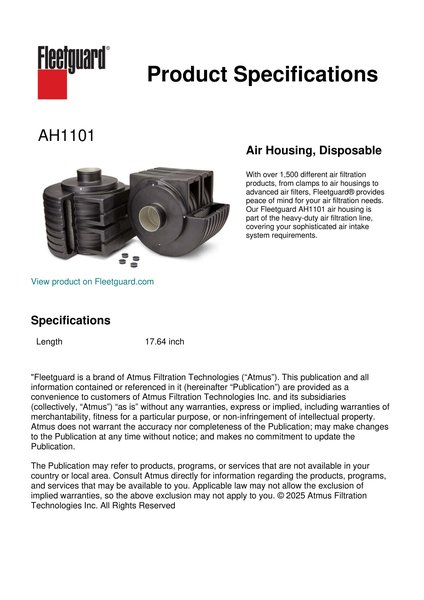 With over 1,500 different air filtration products, from clamps to air housings to advanced air filters, Fleetguard® provides peace of mind for your air filtration needs. Our Fleetguard AH1101 air housing is part of the heavy-duty air filtration line, covering your sophisticated air intake system requirements.Specification