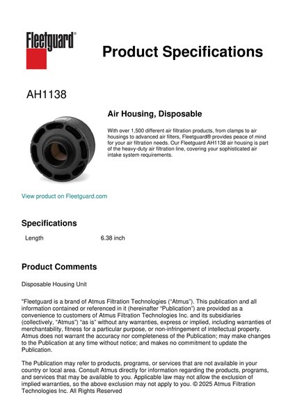 With over 1,500 different air filtration products, from clamps to air housings to advanced air filters, Fleetguard® provides peace of mind for your air filtration needs. Our Fleetguard AH1138 air housing is part of the heavy-duty air filtration line, covering your sophisticated air intake system requirements.Specification