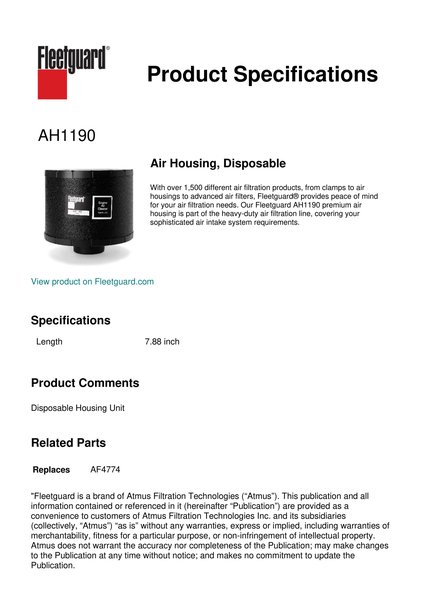 With over 1,500 different air filtration products, from clamps to air housings to advanced air filters, Fleetguard® provides peace of mind for your air filtration needs. Our Fleetguard AH1190 premium air housing is part of the heavy-duty air filtration line, covering your sophisticated air intake system requirements.Specification